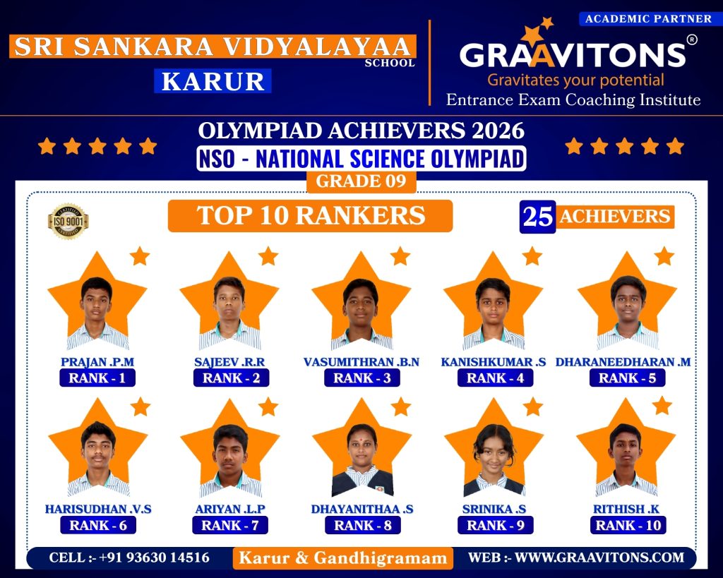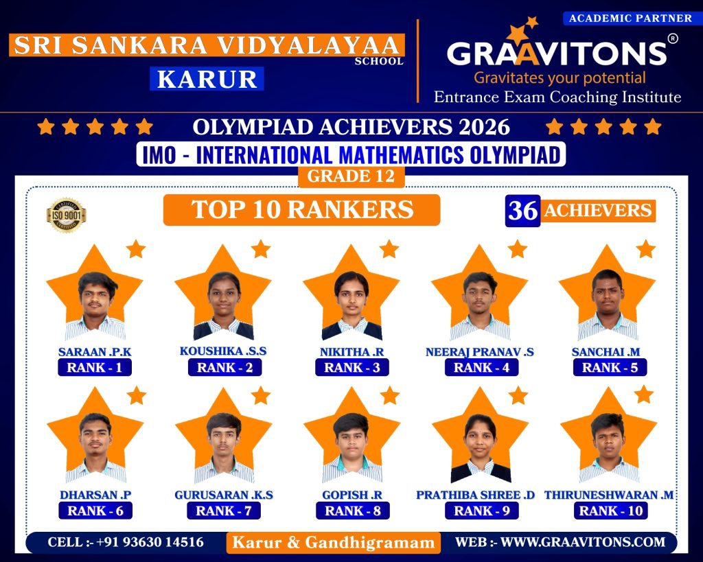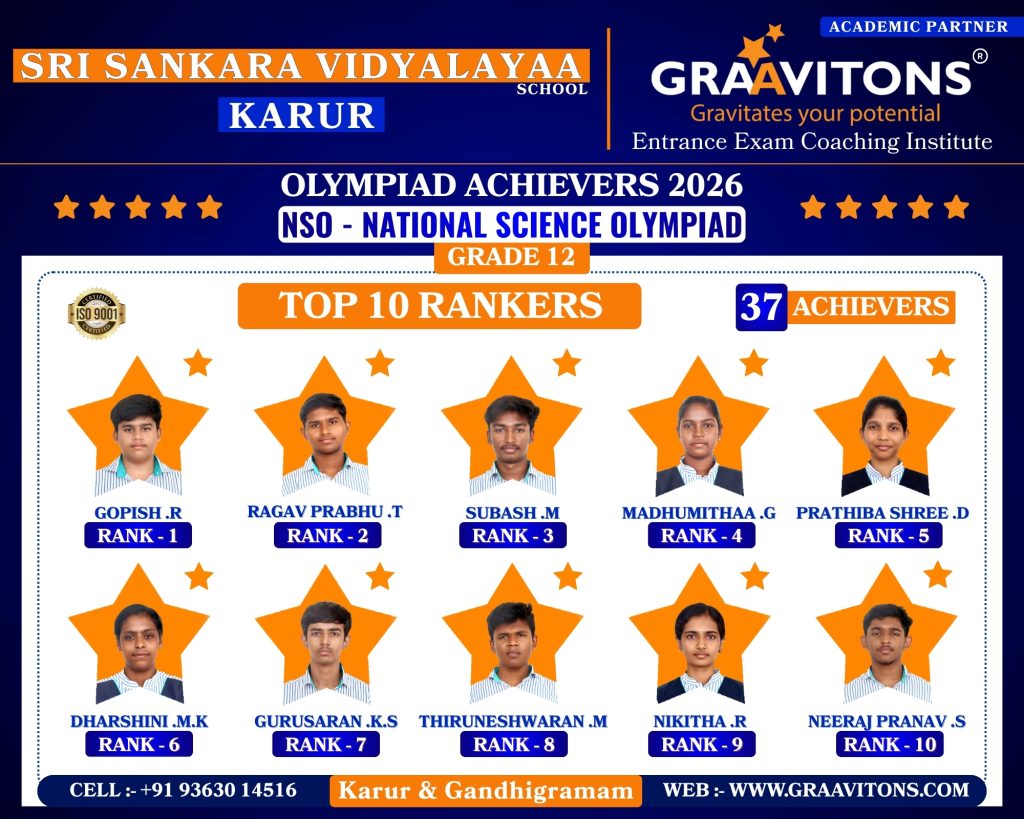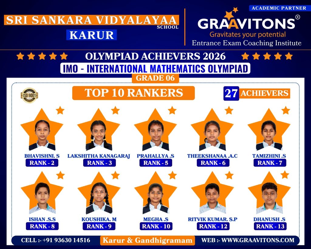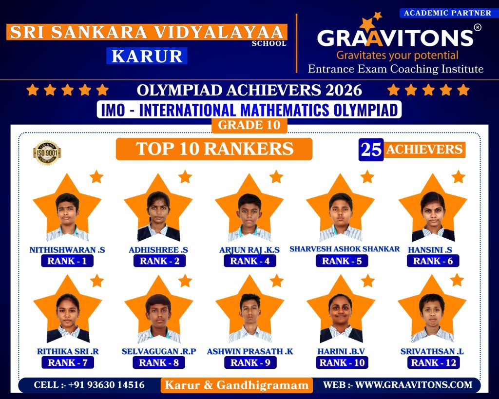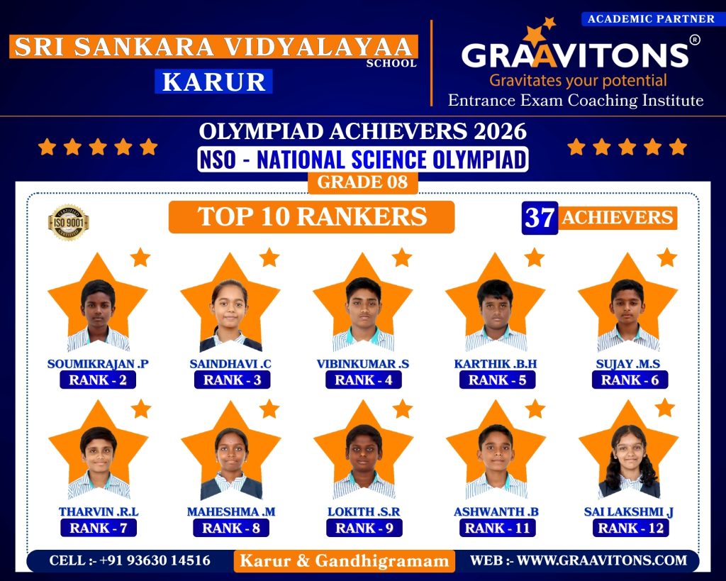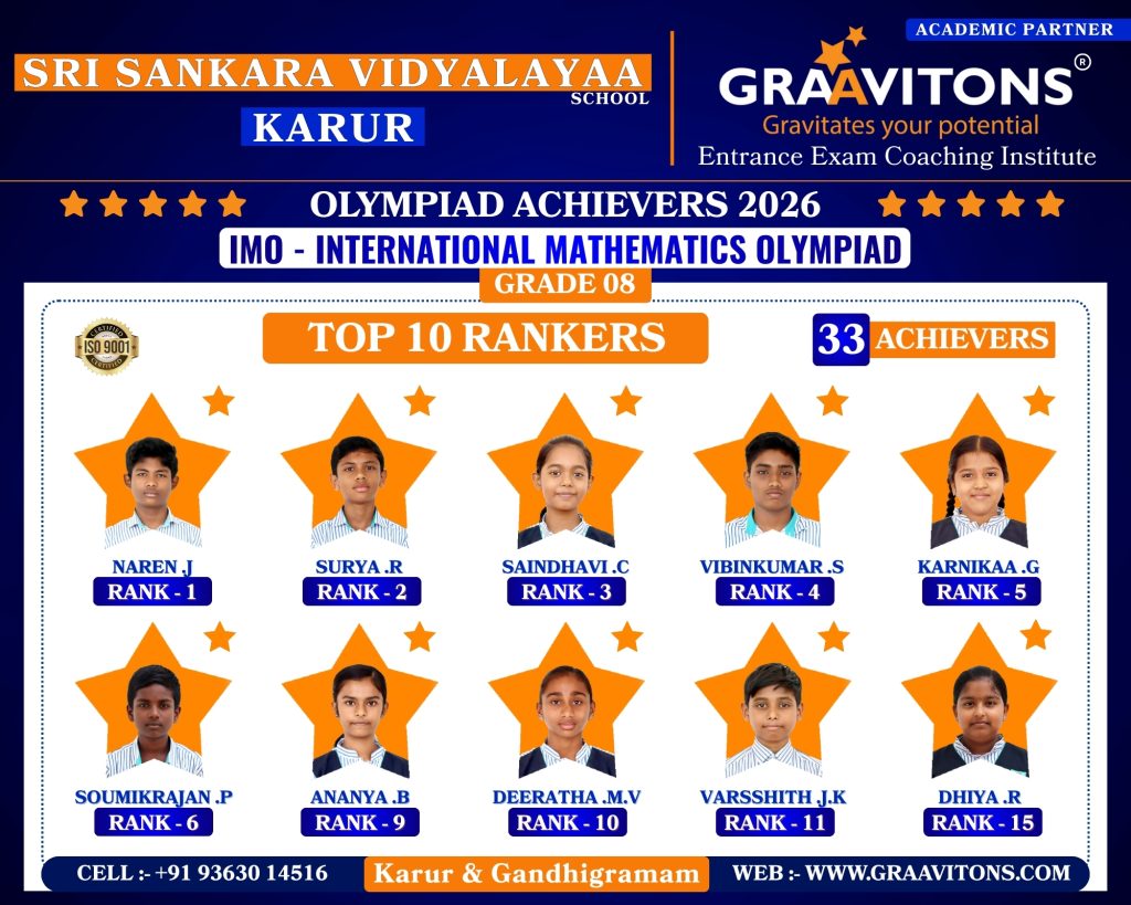 2025 ACHIEVERS (NEET & JEE) ASWANTH. DGovt. Sivagangai Medical College. NIKHILESHWAR. SGovt. Medical College & Hospital, Karur. RAHUL. MAnnapoorana Medical College and Hospitals, Salem. SRIKAVI. NMelmaruvathur Adhiparasakthi Institute of Medical Sciences and Research. Medical College. AMRUTHA. AAnnaii Medical College and Hospitals, Sriperumbudur, Chennai RITHIKA. MGovernment siddha medical college, Chennai LOKAMITHRAN. SIIIT, DHARWAD DARSHAN. SNIT, PATNA SACCHIN. SIIIT, KANCHEEPURAM HARIN. IPONDICHERRY UNIVERSITY, PUDUCHERRY NARENDHIRAN. RSPA, VIJAYAWADA 2024 ACHIEVERS (NEET & JEE) VIKESH. BK.A.P. Viswanatham Govt. Medical College, Tiruchirappalli. SNEKA. A.SGovt. Medical College, Thanjavur. RAKESH. MESIC Medical College, Gulbarga. KISHORE. SGovt. MedicalCollege, Pudukkottai. VIGNESHWARI. J.KGovt. Medical College, Karur. ARUNKUMAR. SGovt. Medical College, Karur. PRAKASH. LGovt. Medical College, Namakkal. RAM ADITHYAN. R.NSri Ramachandra Medical College, Chennai. SUBASH. PSRM Medical College Hospital & Research Centre, Trichy. KANIGA SREE. MDhanalakshmi Srinivasan Medical College, Perambalur. SRIRAM. JIndira Medical College & Hospitals, Tiruvallur. UVASHAKTHI. SNational Institute of Siddha, Chennai ARUNESH. K.SIIT, DELHI RAJ GOWTHAM. MIIT, DELHI RAAGUL KHANNA. KIIT, MADRAS VISHNU CHOLAN. MNIT, TRICHIRAPALLI KAPIL. MNIT, SRINAGAR 2023 ACHIEVERS (NEET & JEE) KAVIN GURUNATH. SGovt. Medical College, Karur. AKSHYA. N Karpaga Vinayaga Medical College, Madhuranthagam. BALANAGARAJA. BIIT, Madras. APARNA. G.R ISER, Thiruvananthapuram. SANJEITH. RBITS, GOA. OLYMPIAD ACHIEVERS 2026
