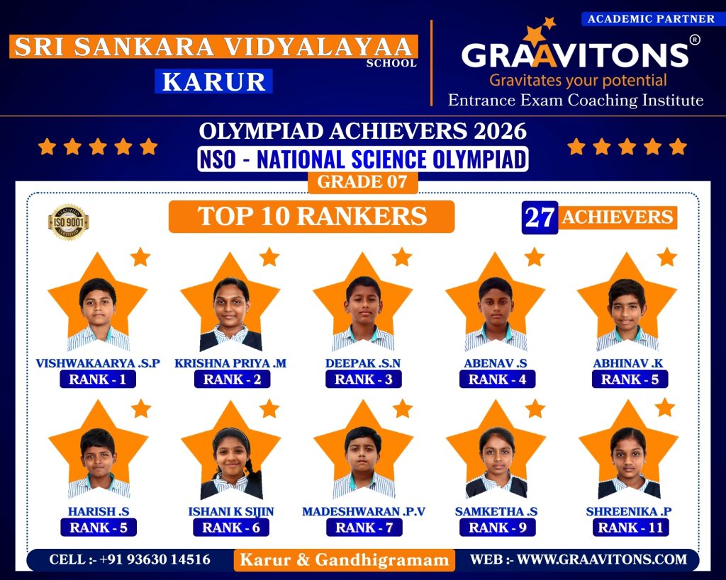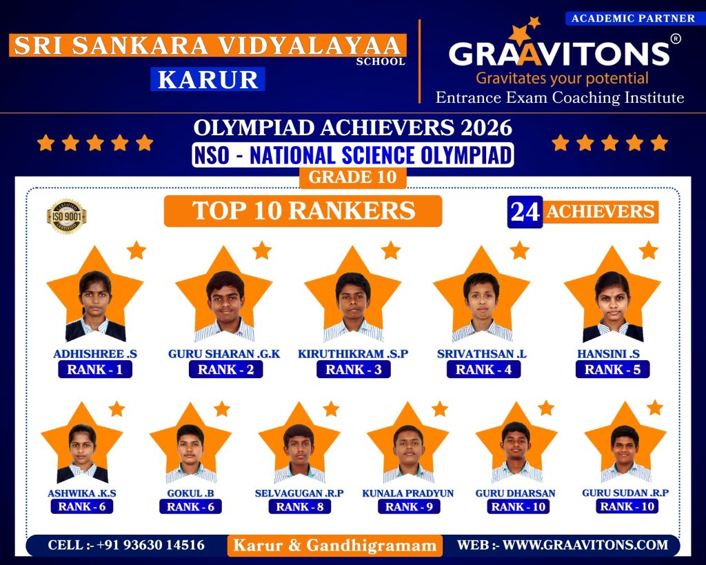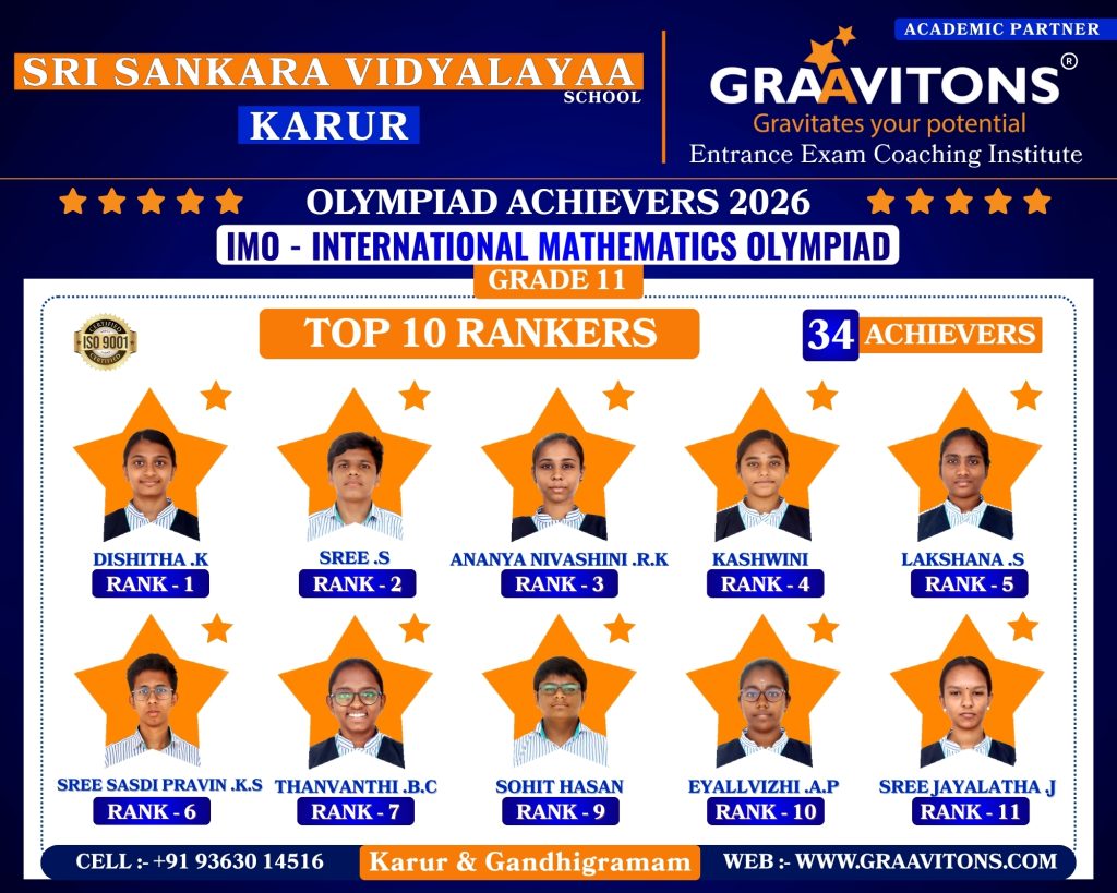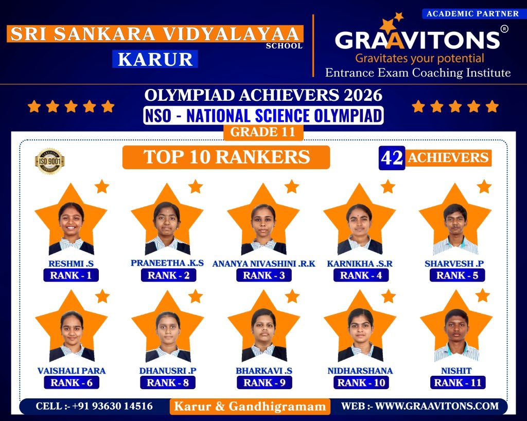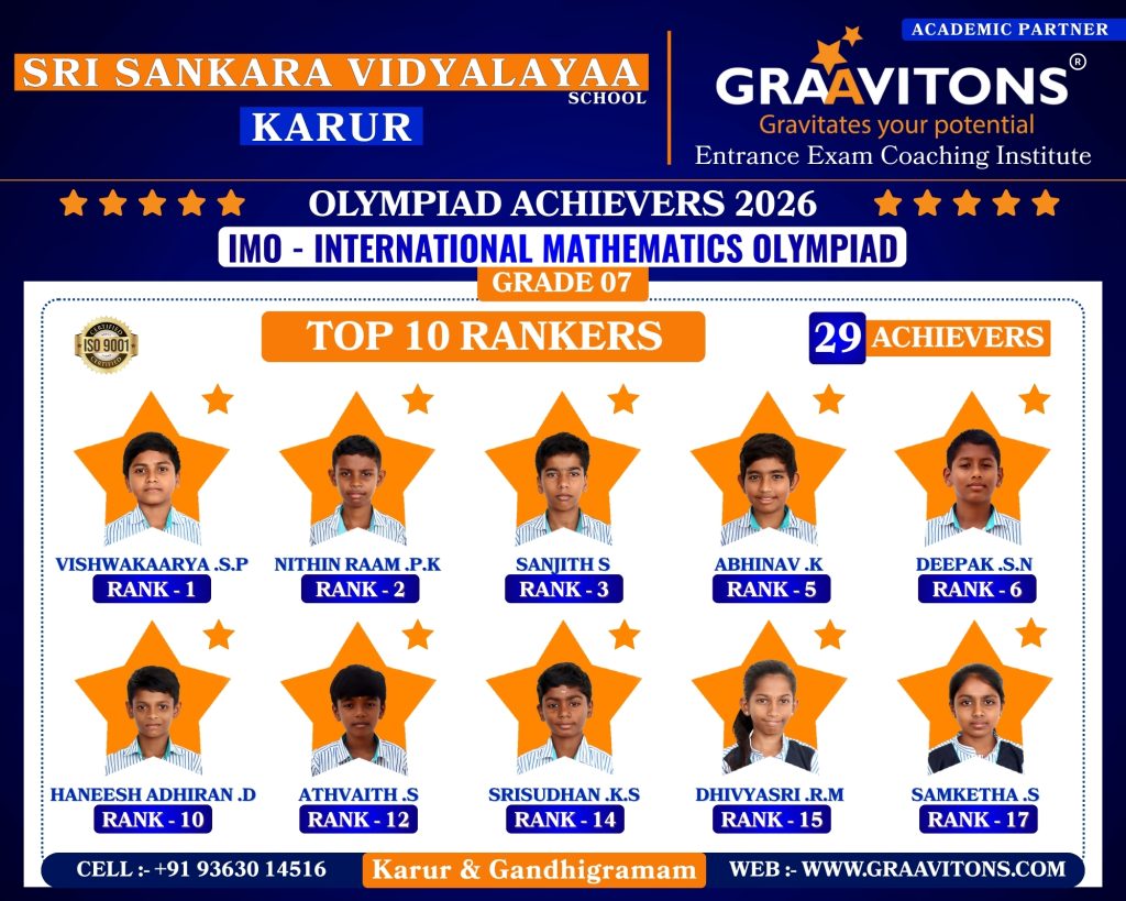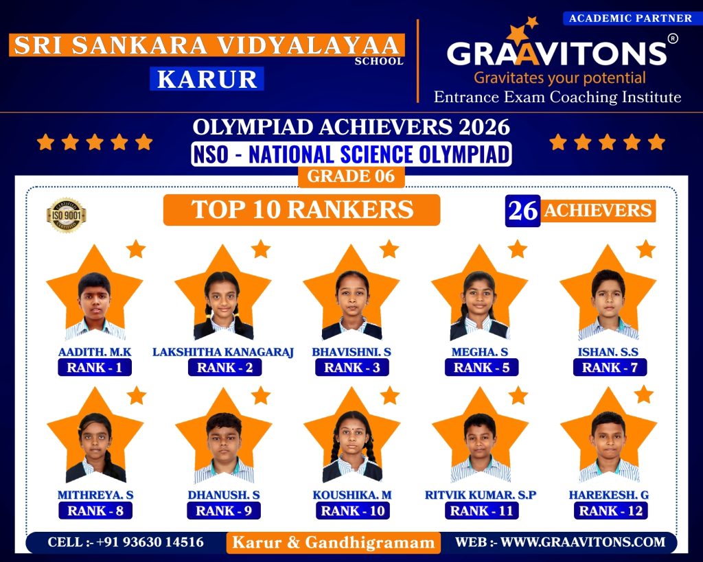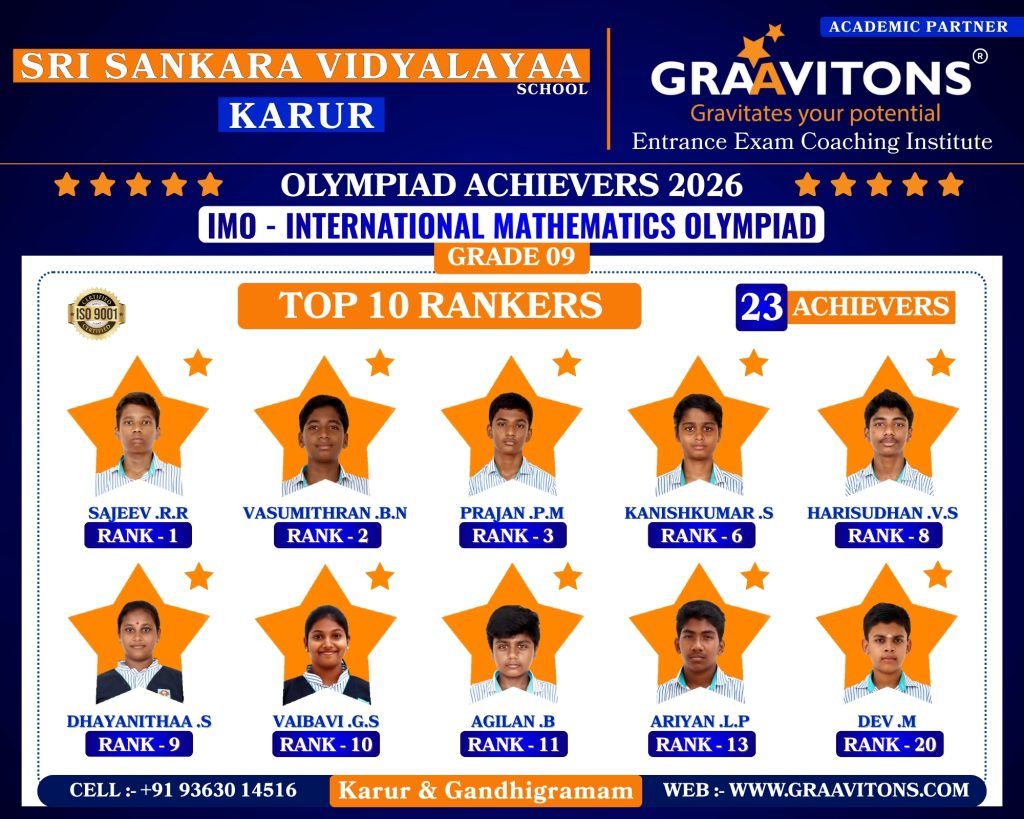 2025 ACHIEVERS (NEET & JEE) ASWANTH. DGovt. Sivagangai Medical College. NIKHILESHWAR. SGovt. Medical College & Hospital, Karur. RAHUL. MAnnapoorana Medical College and Hospitals, Salem. SRIKAVI. NMelmaruvathur Adhiparasakthi Institute of Medical Sciences and Research. Medical College. AMRUTHA. AAnnaii Medical College and Hospitals, Sriperumbudur, Chennai RITHIKA. MGovernment siddha medical college, Chennai LOKAMITHRAN. SIIIT, DHARWAD DARSHAN. SNIT, PATNA SACCHIN. SIIIT, KANCHEEPURAM HARIN. IPONDICHERRY UNIVERSITY, PUDUCHERRY NARENDHIRAN. RSPA, VIJAYAWADA 2024 ACHIEVERS (NEET & JEE) VIKESH. BK.A.P. Viswanatham Govt. Medical College, Tiruchirappalli. SNEKA. A.SGovt. Medical College, Thanjavur. RAKESH. MESIC Medical College, Gulbarga. KISHORE. SGovt. MedicalCollege, Pudukkottai. VIGNESHWARI. J.KGovt. Medical College, Karur. ARUNKUMAR. SGovt. Medical College, Karur. PRAKASH. LGovt. Medical College, Namakkal. RAM ADITHYAN. R.NSri Ramachandra Medical College, Chennai. SUBASH. PSRM Medical College Hospital & Research Centre, Trichy. KANIGA SREE. MDhanalakshmi Srinivasan Medical College, Perambalur. SRIRAM. JIndira Medical College & Hospitals, Tiruvallur. UVASHAKTHI. SNational Institute of Siddha, Chennai ARUNESH. K.SIIT, DELHI RAJ GOWTHAM. MIIT, DELHI RAAGUL KHANNA. KIIT, MADRAS VISHNU CHOLAN. MNIT, TRICHIRAPALLI KAPIL. MNIT, SRINAGAR 2023 ACHIEVERS (NEET & JEE) KAVIN GURUNATH. SGovt. Medical College, Karur. AKSHYA. N Karpaga Vinayaga Medical College, Madhuranthagam. BALANAGARAJA. BIIT, Madras. APARNA. G.R ISER, Thiruvananthapuram. SANJEITH. RBITS, GOA. OLYMPIAD ACHIEVERS 2026